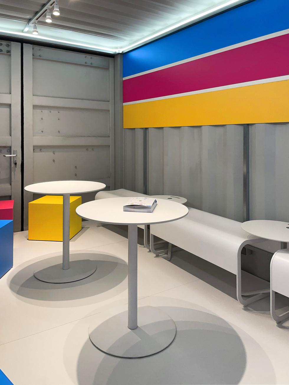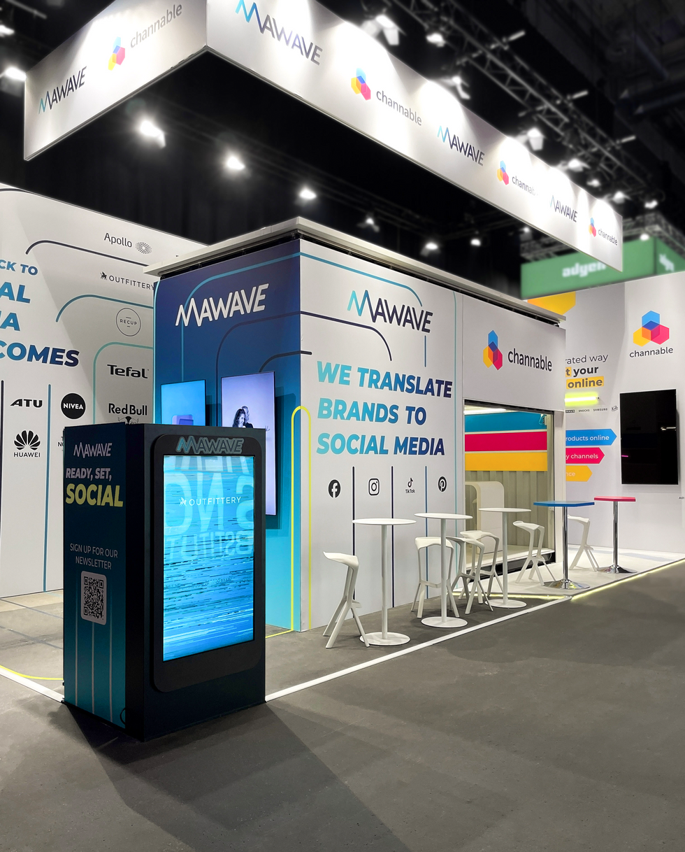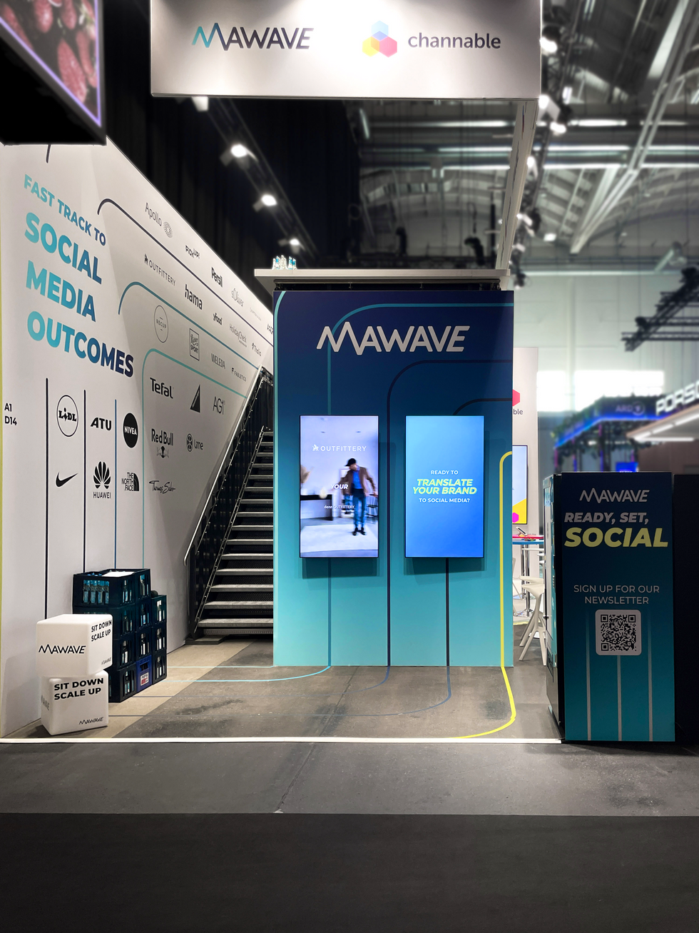 aus dieser aufgabenstellung heraus entstand ein durchdachtes standdesign mit einem zentralen architektonischen element: einem container, der optisch akzente setzte und funktional überzeugte. die obere ebene wurde zur meeting-terrasse für Mawave, während Channable das innere als gemütliche meeting-lounge nutzte – beide boten rückzugsorte für ruhige gespräche.
